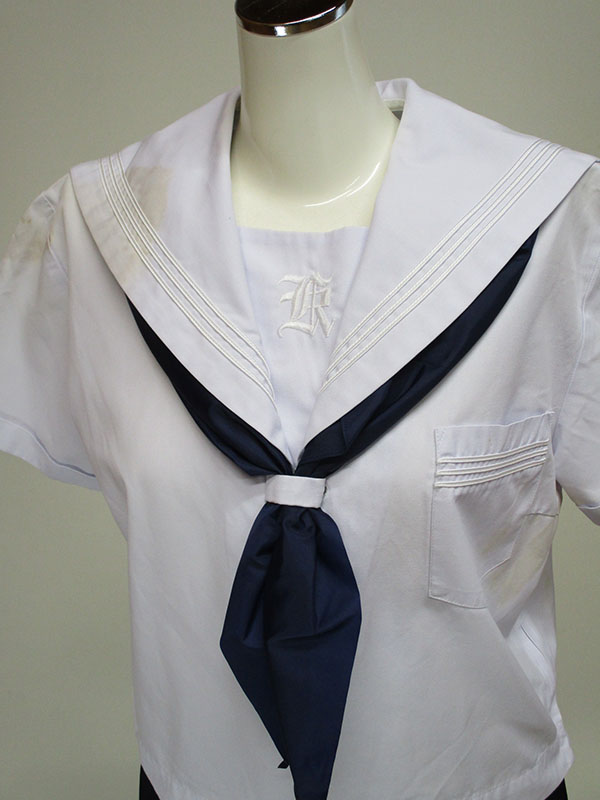 襟等に白3本ライン、紺色スカーフ付、胸当てに刺しゅう、シミ汚れあり、サイドファスナー