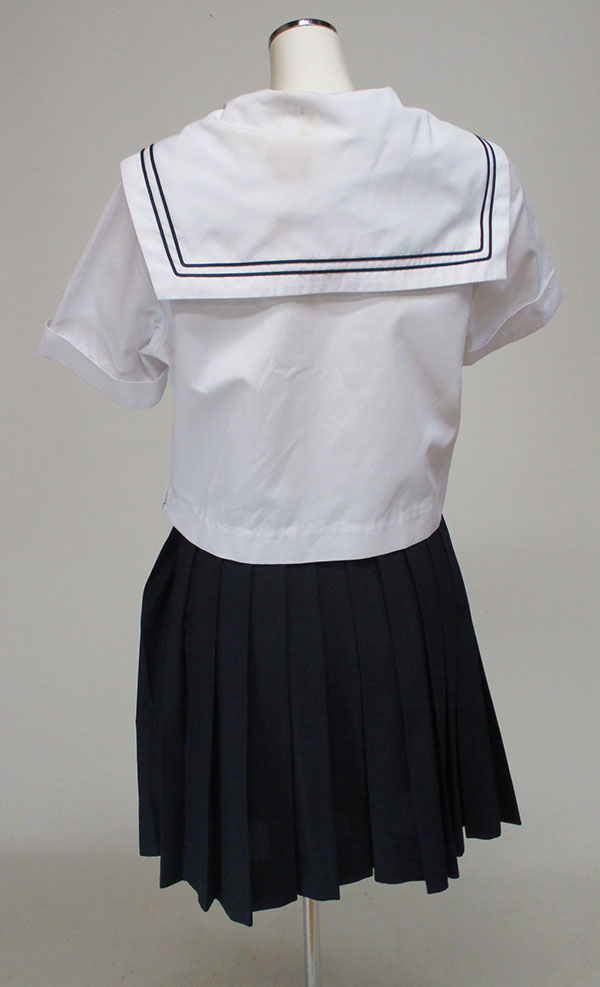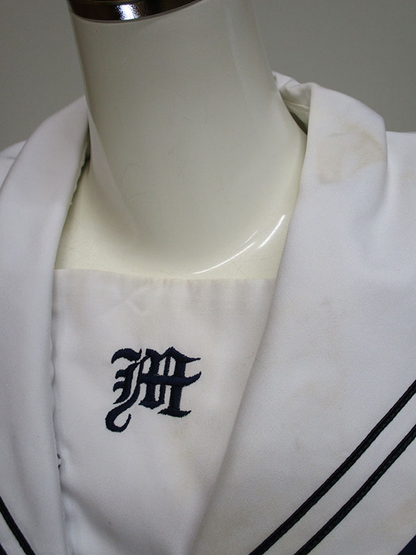 襟に紺2本ライン、サイドファスナー、紺色スカーフ付、胸当てに刺しゅう、シミ汚れあり