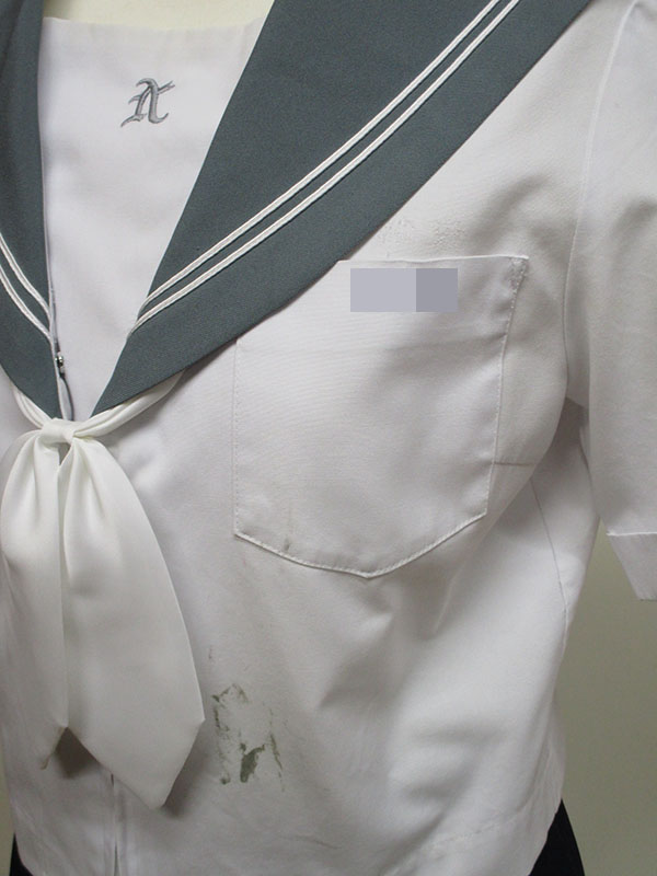 グレー襟に白2本ライン、白色サテンリボン付、胸当てに刺しゅう、胸ポケットに名前刺しゅう、汚れあり、前ファスナー、ヒダ24本
