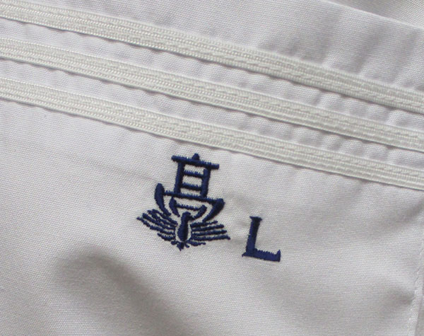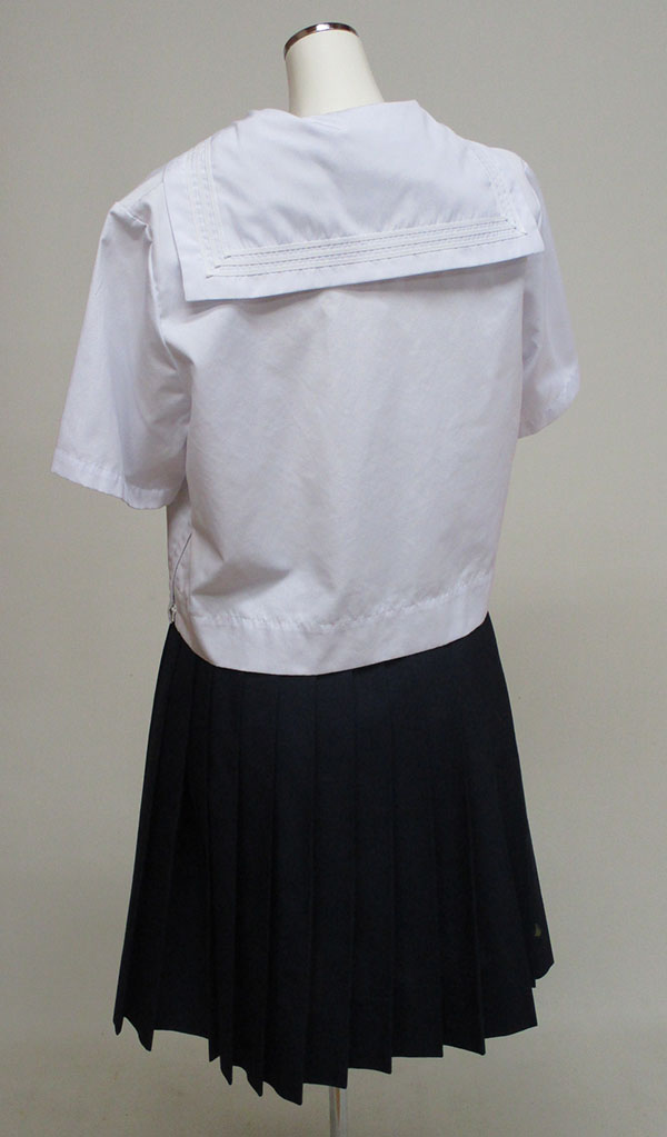襟等に白3本ライン、紺色スカーフ付、胸ポケットに刺しゅう、サイドファスナー、ヒダ28本
