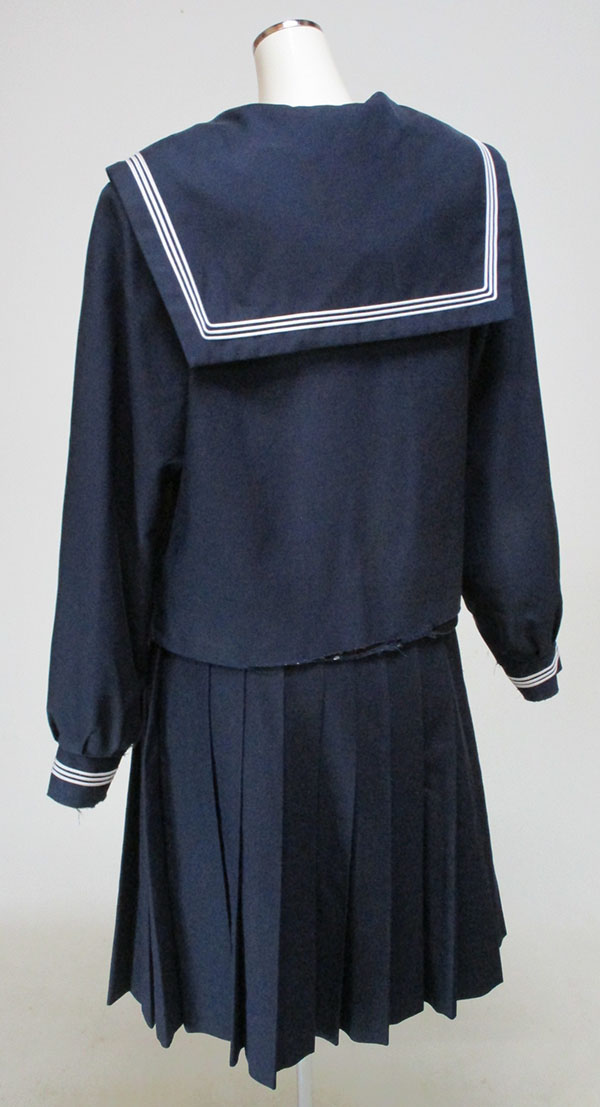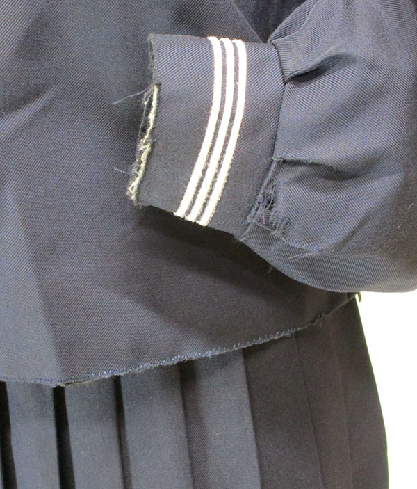 襟等に白3本ライン、サイドファスナー、黄色スカーフ付、裾・袖口ヤブレ・ホツレあり、ヒダ24本