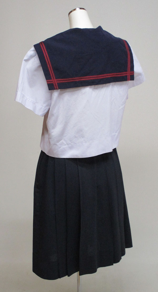 紺襟にエンジ2本ライン、エンジスカーフ付、スカーフ止めに刺しゅう、前ファスナー、ヒダBOX14本