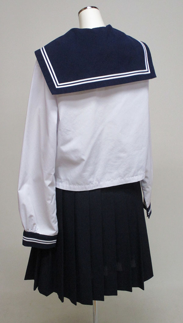 紺襟・カフスに白2本ライン、茶色スカーフ付、サイドファスナー、ヒダ24本